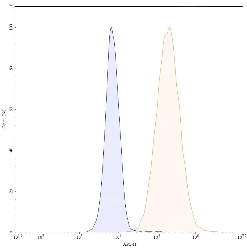 Flow-cytometry using APC anti-human CD66a antibody. HT-29 cells were stained with an irrelevant antibody (Blue Histogram) or an APC anti-human CD66a monoclonal antibody (Catalog No.:TD-HB880137, Yellow Histogram) at a concentration of 5 µg/ml for 30 mins at RT. After washing, cells analysed on a NovoCyte Flow Cytometer.