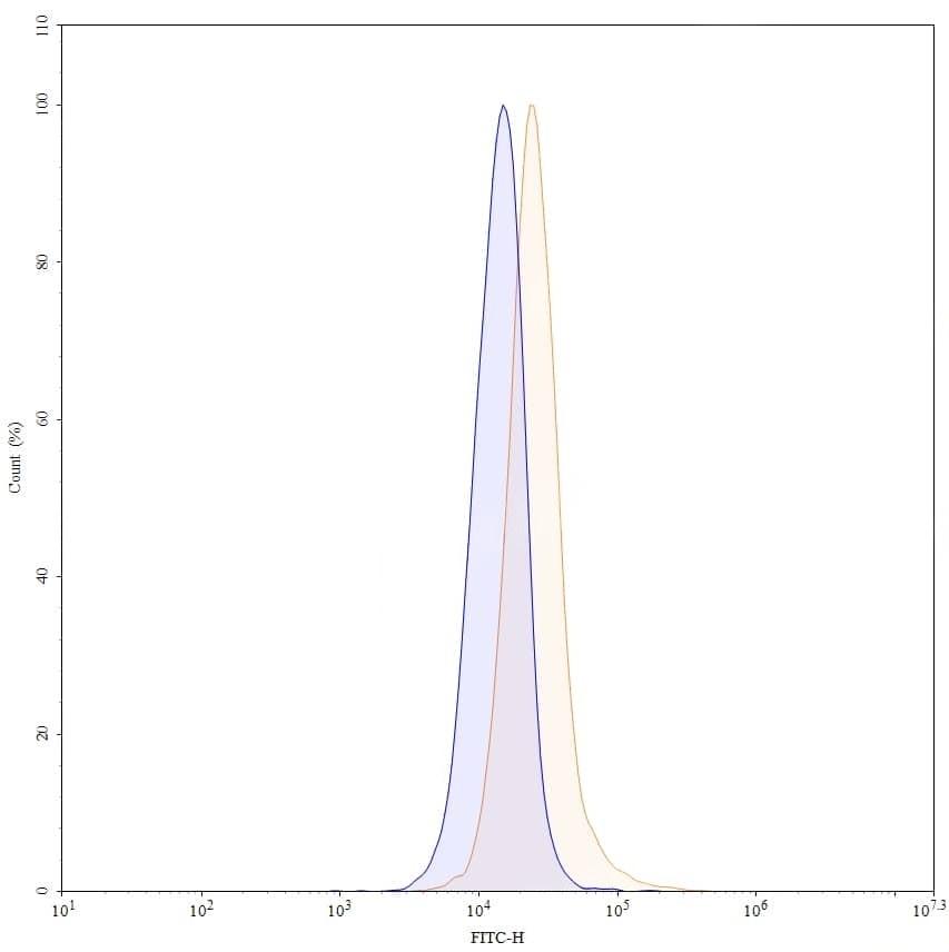 Flow-cytometry using FITC anti-human CD332 antibody. CACO-2 cells were stained with an irrelevant antibody (Blue Histogram) or an FITC anti-human CD332 monoclonal antibody (Catalog No.:TD-HB863117, Yellow Histogram) at a concentration of 5 µg/ml for 30 mins at RT. After washing, cells analysed on a NovoCyte Flow Cytometer.
