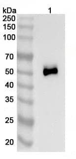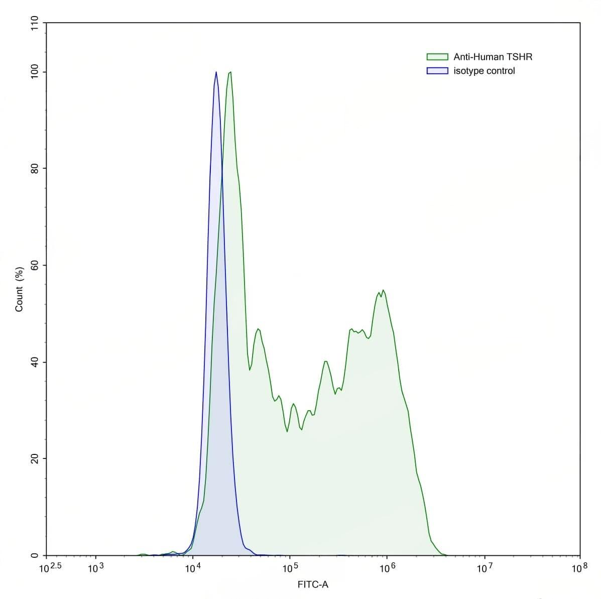 Flow-cytometry using anti-human TSHR antibody.TSHR Transfected CHO cells were stained with an irrelevant antibody (Blue Histogram) or an anti-human TSHR antibody monoclonal antibody (Catalog No.:TD-HB852207 ,Green Histogram) at a concentration of 5 µg/ml for 30 mins at RT. After washing, bound antibody was detected using a FITC conjugated goat anti-mouse antibody (Catalog No.:TD-MF690414) and cells analysed on a NovoCyte Flow Cytometer. | Western blot analysis was performed using anti-TSHR monoclonal antibody at 1ug/mL on various samples.Lane 1:Mouse ovary lysate