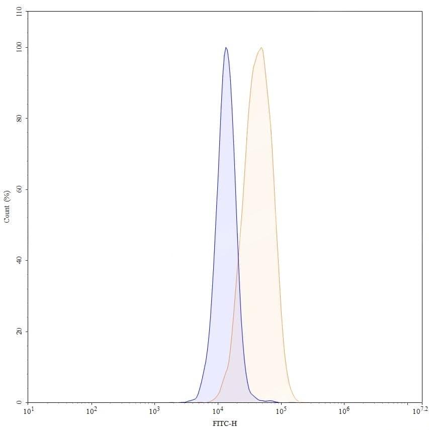 Flow-cytometry using FITC anti-human FOLR1 antibody. Hela cells were stained with an irrelevant antibody (Blue Histogram) or an FITC anti-human FOLR1 monoclonal antibody (Catalog No.:TD-HB825117, Yellow Histogram) at a concentration of 5 µg/ml for 30 mins at RT. After washing, and cells analysed on a NovoCyte Flow Cytometer.