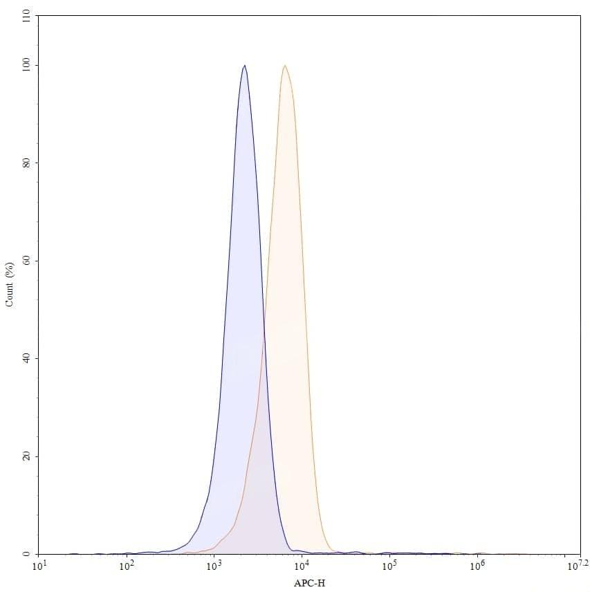 Flow-cytometry using APC anti-human CD11a antibody. Jurkat cells were stained with an irrelevant antibody (Blue Histogram) or an APC anti-human CD11a monoclonal antibody (Catalog No.:TD-HB805137, Yellow Histogram) at a concentration of 5 µg/ml for 30 mins at RT. After washing, and cells analysed on a NovoCyte Flow Cytometer.