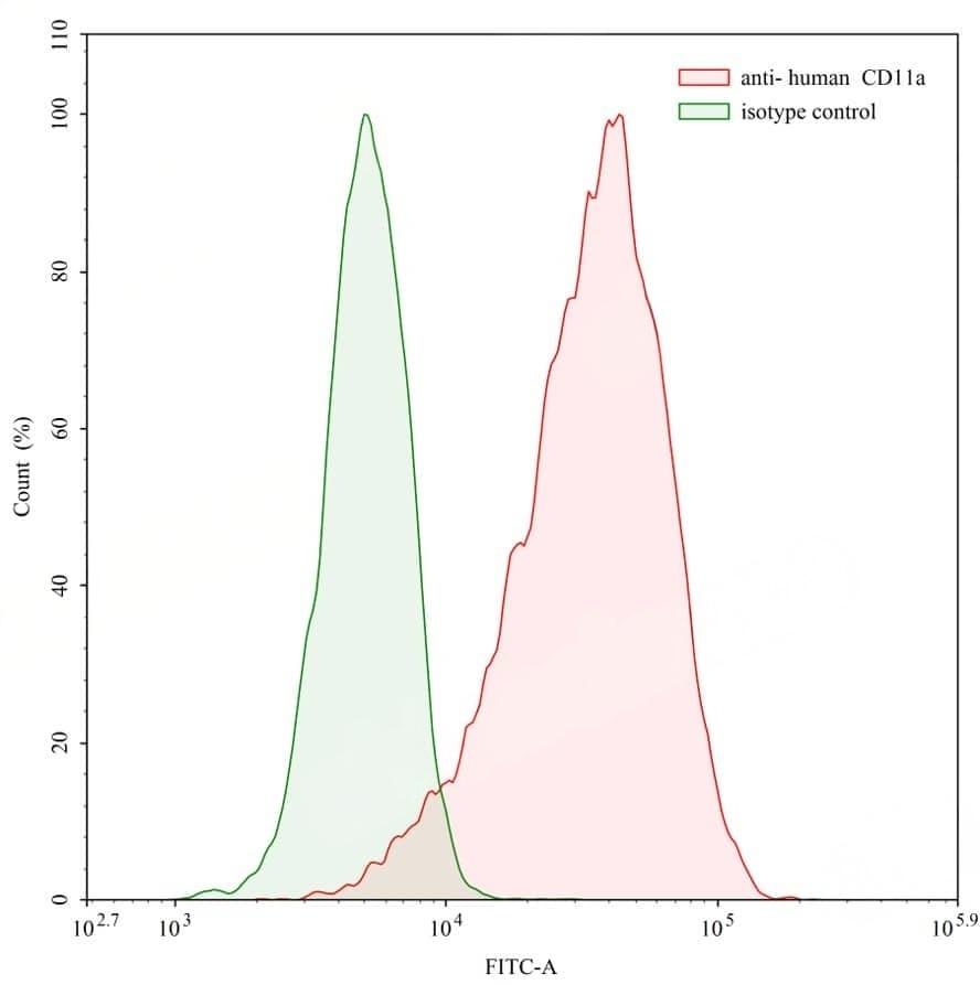 SEC-HPLC detection for Anti-Human CD11a/ITGAL Antibody (ABS0709). | Flow-cytometry using anti-human CD11a antibody. Human Jurkat cell line were stained with an irrelevant antibody (Green Histogram) or an anti-human CD11a antibody monoclonal antibody (Catalog No.:TD-HB805107 , Red Histogram) at a concentration of 20 µg/ml for 30 mins at RT. After washing, bound antibody was detected using a CoraLite488 conjugated goat anti-mouse antibody (Catalog No.:TD-MF690314) and cells analysed on a NovoCyte Flow Cytometer.