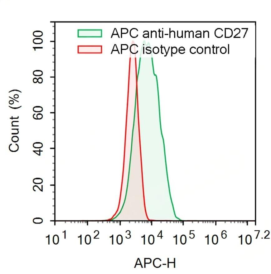 Flow-cytometry using APC anti-Human CD27 antibody. Raji cells were stained with an irrelevant antibody (Red Histogram) or an APC anti-Human CD27 antibody monoclonal antibody (Catalog No.:TD-HB796337 , Green Histogram) at a concentration of 5 µg/ml for 30 mins at RT. After washing, cells analysed on a NovoCyte Flow Cytometer.