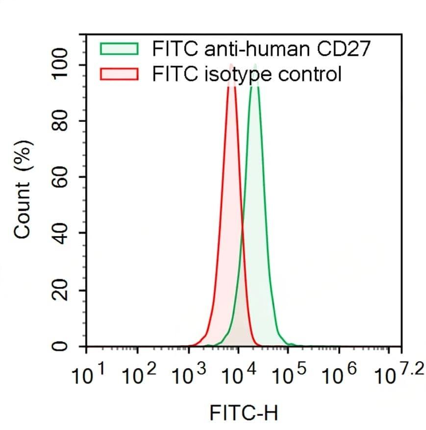 Flow-cytometry using FITC anti-Human CD27 antibody. Raji cells were stained with an irrelevant antibody (Red Histogram) or a FITC anti-Human CD27 antibody monoclonal antibody (Catalog No.:TD-HB796317 , Green Histogram) at a concentration of 5 µg/ml for 30 mins at RT. After washing, cells analysed on a NovoCyte Flow Cytometer.