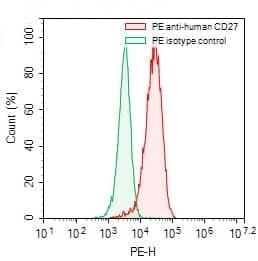 Flow-cytometry using PE anti-human CD27 antibody. Raji cells were stained with an irrelevant antibody (Green Histogram) or a PE anti-human CD27 antibody monoclonal antibody (Catalog No.:TD-HB796227, Red Histogram) at a concentration of 5 µg/ml for 30 mins at RT. After washing, cells analysed on a NovoCyte Flow Cytometer.