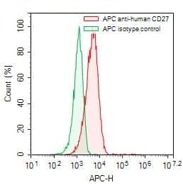 Flow-cytometry using APC anti-human CD27 antibody. Raji cells were stained with an irrelevant antibody (Green Histogram) or an APC anti-human CD27 antibody monoclonal antibody (Catalog No.:TD-HB796137, Red Histogram) at a concentration of 5 µg/ml for 30 mins at RT. After washing, cells analysed on a NovoCyte Flow Cytometer.
