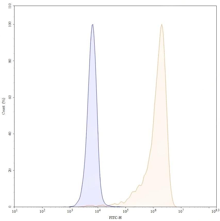 Flow-cytometry using anti-human CD27 antibody. Untransfected cells (blue Histogram) and Transfected cells (Yellow Histogram) were stained with an anti-human CD27 monoclonal antibody (Catalog No.:TD-HB796107) at a concentration of 5 µg/ml for 30 mins at RT. After washing, bound antibody was detected using a Goat Anti-Mouse IgG H&L Polyclonal Antibody, FITC (Catalog No.:TD-MF690414) and cells analysed on a NovoCyte Flow Cytometer.