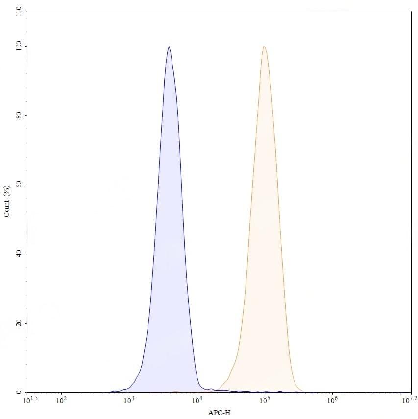 Flow-cytometry using APC anti-human CD40 antibody. U2OS cells were stained with an irrelevant antibody (Blue Histogram) or an APC anti-human CD40 monoclonal antibody (Catalog No.:TD-HB782237, Yellow Histogram) at a concentration of 5 µg/ml for 30 mins at RT. After washing, and cells analysed on a NovoCyte Flow Cytometer.