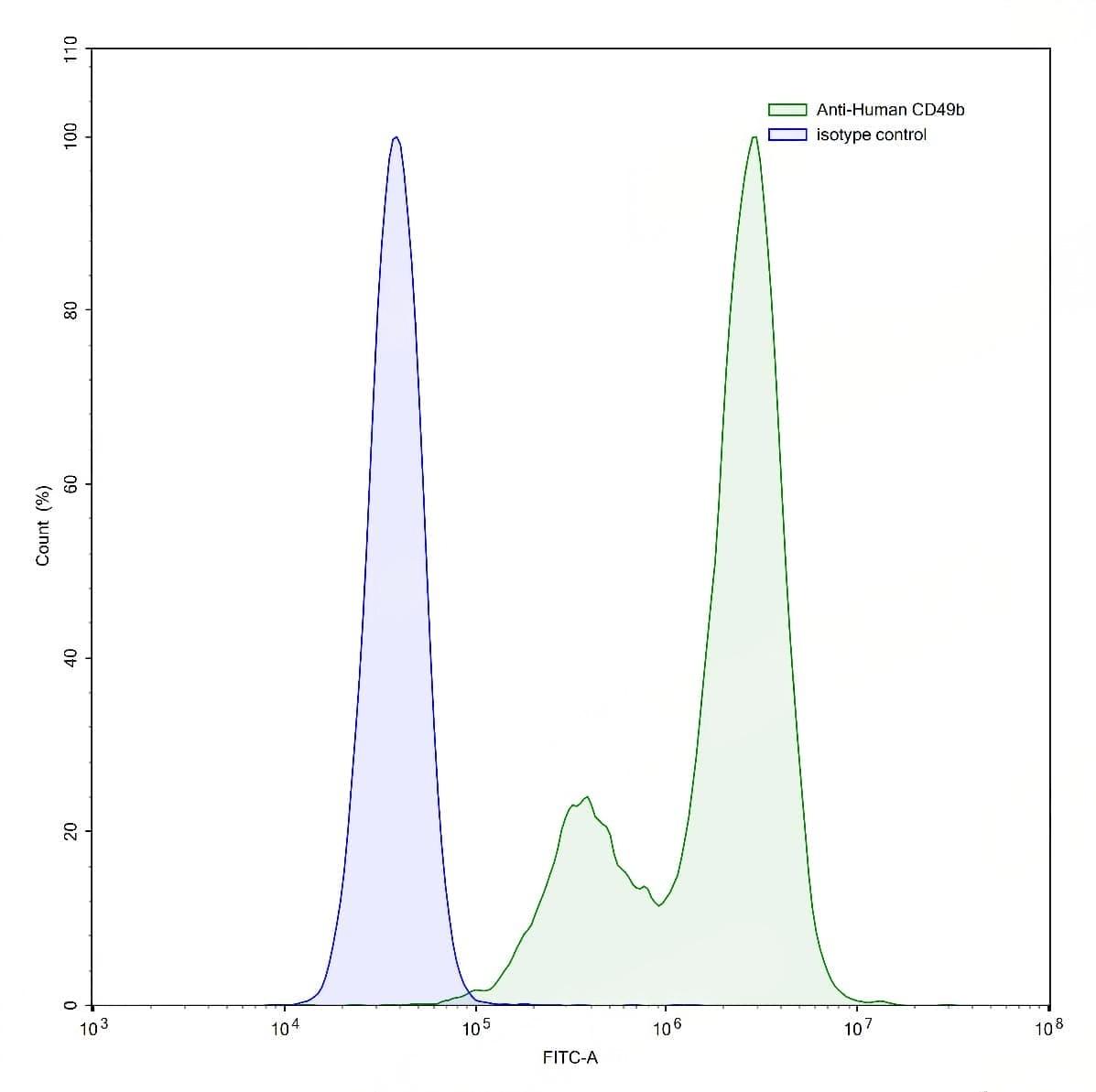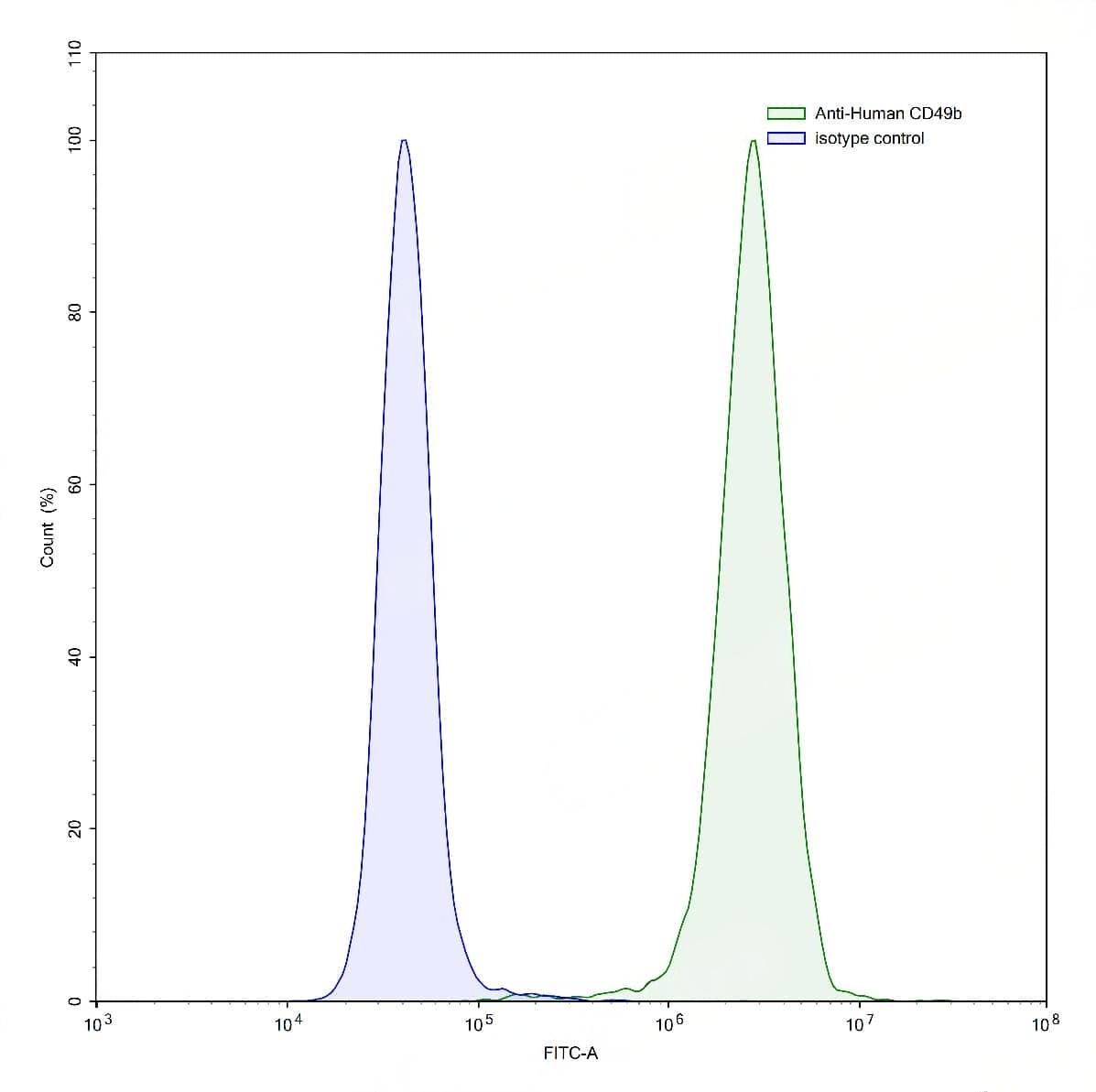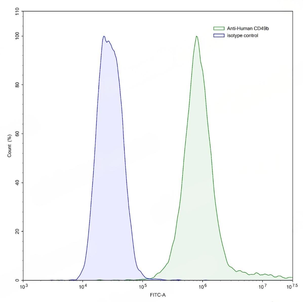 Flow-cytometry using anti-human CD49b antibody.293T cells were stained with an irrelevant antibody (Blue Histogram) or an anti-human CD49b antibody monoclonal antibody (Catalog No.:TD-HB772107 ,Green Histogram) at a concentration of 5 µg/ml for 30 mins at RT. After washing, bound antibody was detected using a FITC conjugated goat anti-mouse antibody (Catalog No.:TD-MF690414) and cells analysed on a NovoCyte Flow Cytometer. | Flow-cytometry using anti-human CD49b antibody.HaCaT cells were stained with an irrelevant antibody (Blue Histogram) or an anti-human CD49b antibody monoclonal antibody (Catalog No.:TD-HB772107 ,Green Histogram) at a concentration of 5 µg/ml for 30 mins at RT. After washing, bound antibody was detected using a FITC conjugated goat anti-mouse antibody (Catalog No.:TD-MF690414) and cells analysed on a NovoCyte Flow Cytometer. | Flow-cytometry using anti-human CD49b antibody.HUVEC cells were stained with an irrelevant antibody (Blue Histogram) or an anti-human CD49b antibody monoclonal antibody (Catalog No.:TD-HB772107 ,Green Histogram) at a concentration of 5 µg/ml for 30 mins at RT. After washing, bound antibody was detected using a FITC conjugated goat anti-mouse antibody (Catalog No.:TD-MF690414) and cells analysed on a NovoCyte Flow Cytometer. | Flow-cytometry using anti-human CD49b antibody.A431 cells were stained with an irrelevant antibody (Blue Histogram) or an anti-human CD49b antibody monoclonal antibody (Catalog No.:TD-HB772107 ,Green Histogram) at a concentration of 5 µg/ml for 30 mins at RT. After washing, bound antibody was detected using a FITC conjugated goat anti-mouse antibody (Catalog No.:TD-MF690414) and cells analysed on a NovoCyte Flow Cytometer.