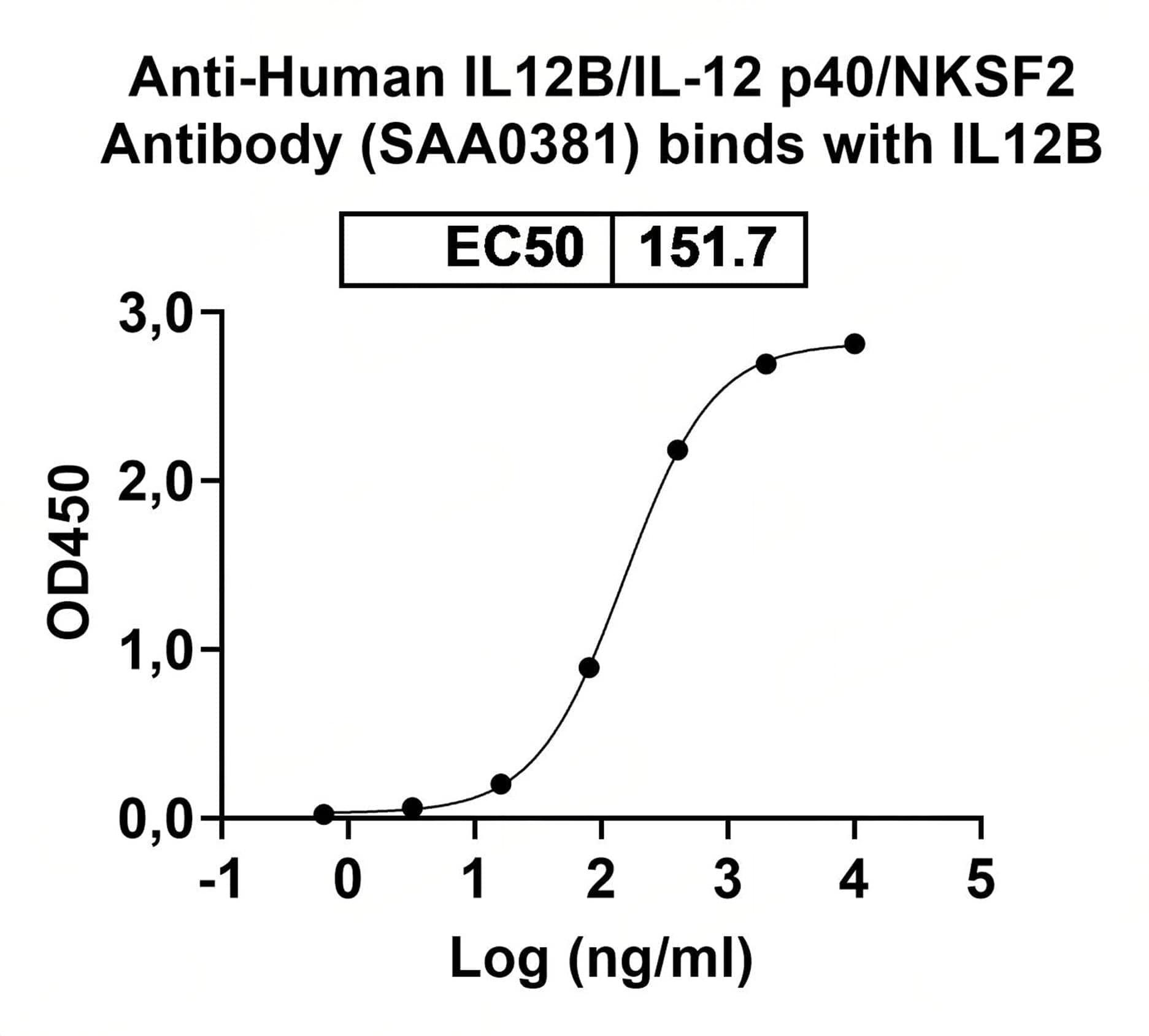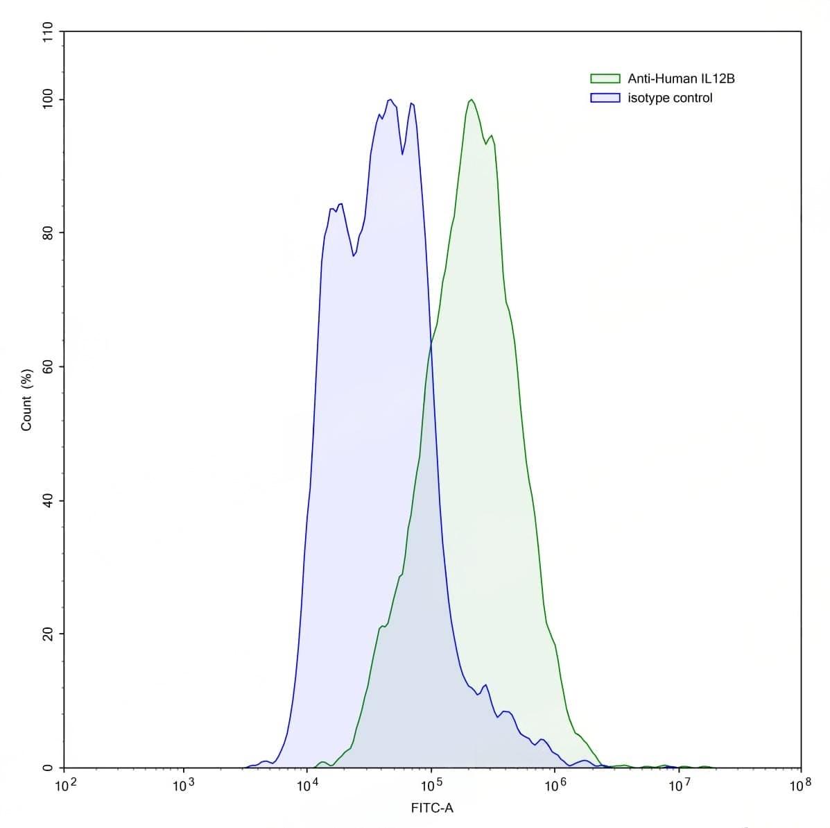 Detects Human IL12B/IL-12 p40/NKSF2 in indirect ELISAs. | Flow-cytometry using anti-human IL12B antibody.IL12B Transfected CHO cells were stained with an irrelevant antibody (Blue Histogram) or an anti-human IL12B antibody monoclonal antibody (Catalog No.:TD-HB769107 ,Green Histogram) at a concentration of 5 µg/ml for 30 mins at RT. After washing, bound antibody was detected using a FITC conjugated goat anti-mouse antibody (Catalog No.:TD-MF690414) and cells analysed on a NovoCyte Flow Cytometer.
