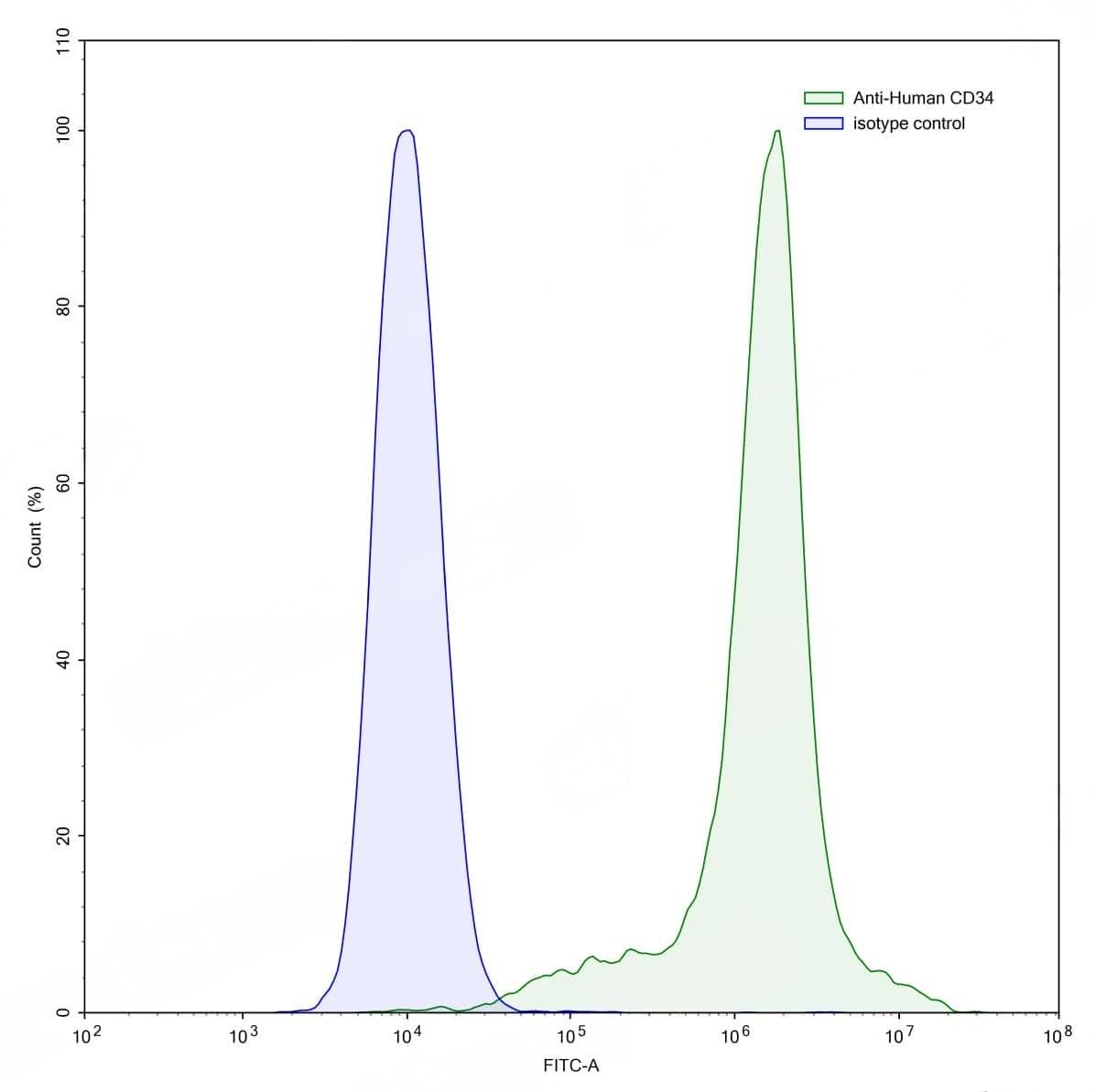 SEC-HPLC detection for Anti-Human CD34 Antibody (QBEND-10). | Flow-cytometry using anti-human CD34 antibody.CD34 Transfected CHO cells were stained with an irrelevant antibody (Blue Histogram) or an anti-human CD34 antibody monoclonal antibody (Catalog No.:TD-HB766207 ,Green Histogram) at a concentration of 5 µg/ml for 30 mins at RT. After washing, bound antibody was detected using a FITC conjugated goat anti-mouse antibody (Catalog No.:TD-MF690414) and cells analysed on a NovoCyte Flow Cytometer. | Flow-cytometry using anti-human CD34 antibody.KG-1 cells were stained with an irrelevant antibody (Blue Histogram) or an anti-human CD34 antibody monoclonal antibody (Catalog No.:TD-HB766207 ,Green Histogram) at a concentration of 5 µg/ml for 30 mins at RT. After washing, bound antibody was detected using a FITC conjugated goat anti-mouse antibody (Catalog No.:TD-MF690414) and cells analysed on a NovoCyte Flow Cytometer.