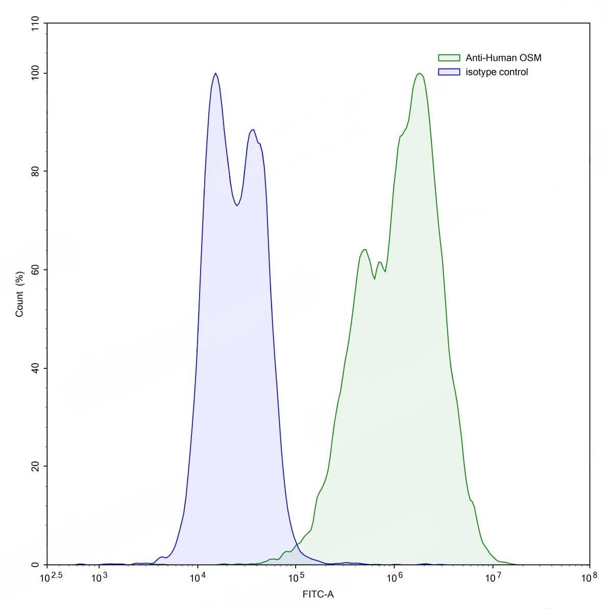 Detects Human OSM/Oncostatin-M in indirect ELISAs. | Flow-cytometry using anti-human OSM antibody.OSM/Oncostatin-M Transfected CHO cells were stained with an irrelevant antibody (Blue Histogram) or an anti-human OSM antibody monoclonal antibody (Catalog No.:TD-HB745107 ,Green Histogram) at a concentration of 5 µg/ml for 30 mins at RT. After washing, bound antibody was detected using a FITC conjugated goat anti-mouse antibody (Catalog No.:TD-MF690414) and cells analysed on a NovoCyte Flow Cytometer.