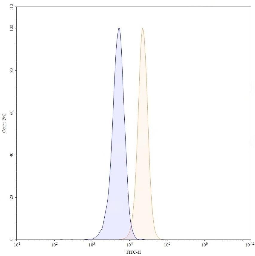 Flow-cytometry using FITC anti-human CD13 antibody. U937 cells were stained with an irrelevant antibody (Blue Histogram) or an FITC anti-human CD13 monoclonal antibody (Catalog No.:TD-HB650217, Yellow Histogram) at a concentration of 5 µg/ml for 30 mins at RT. After washing, and cells analysed on a NovoCyte Flow Cytometer.