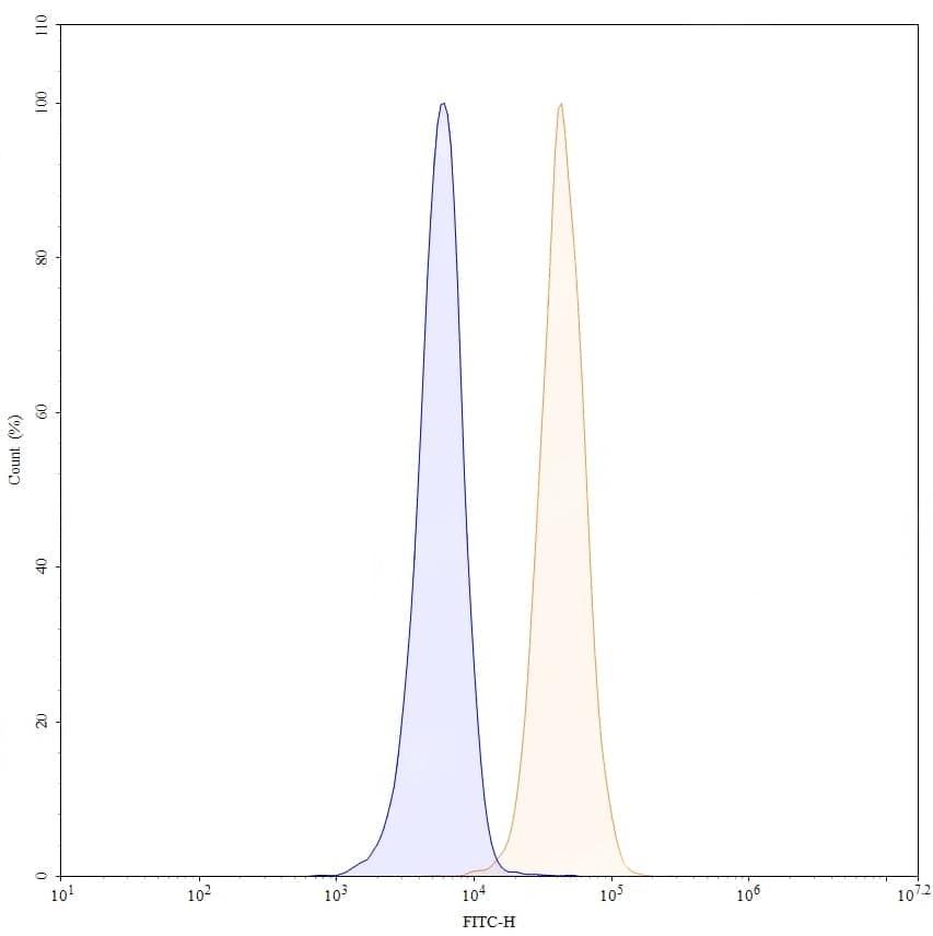 Flow-cytometry using FITC anti-human CD13 antibody. U937 cells were stained with an irrelevant antibody (Blue Histogram) or an FITC anti-human CD13 monoclonal antibody (Catalog No.:TD-HB650117, Yellow Histogram) at a concentration of 5 µg/ml for 30 mins at RT. After washing, and cells analysed on a NovoCyte Flow Cytometer.
