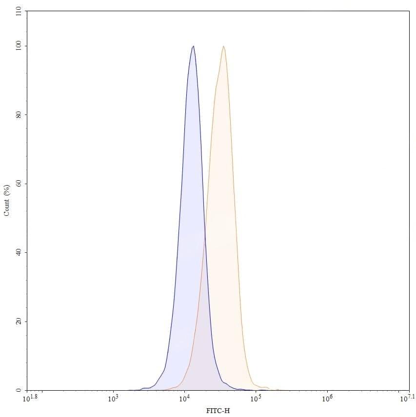 Flow-cytometry using FITC anti-human CD105 antibody. Hela cells were stained with an irrelevant antibody (Blue Histogram) or an FITC anti-human CD105 monoclonal antibody (Catalog No.:TD-HB604117, Yellow Histogram) at a concentration of 5 µg/ml for 30 mins at RT. After washing, and cells analysed on a NovoCyte Flow Cytometer.
