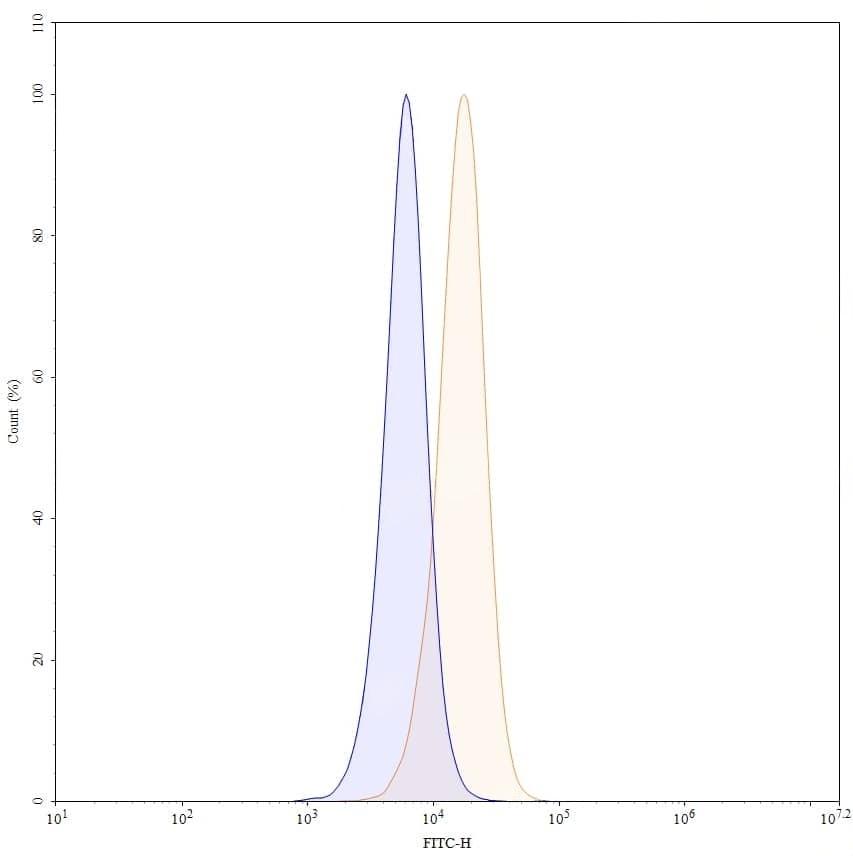 Flow-cytometry using FITC anti-human CD182 antibody. THP-1 cells were stained with an irrelevant antibody (Blue Histogram) or an FITC anti-human CD182 monoclonal antibody (Catalog No.:TD-HB243117, Yellow Histogram) at a concentration of 5 µg/ml for 30 mins at RT. After washing, and cells analysed on a NovoCyte Flow Cytometer.
