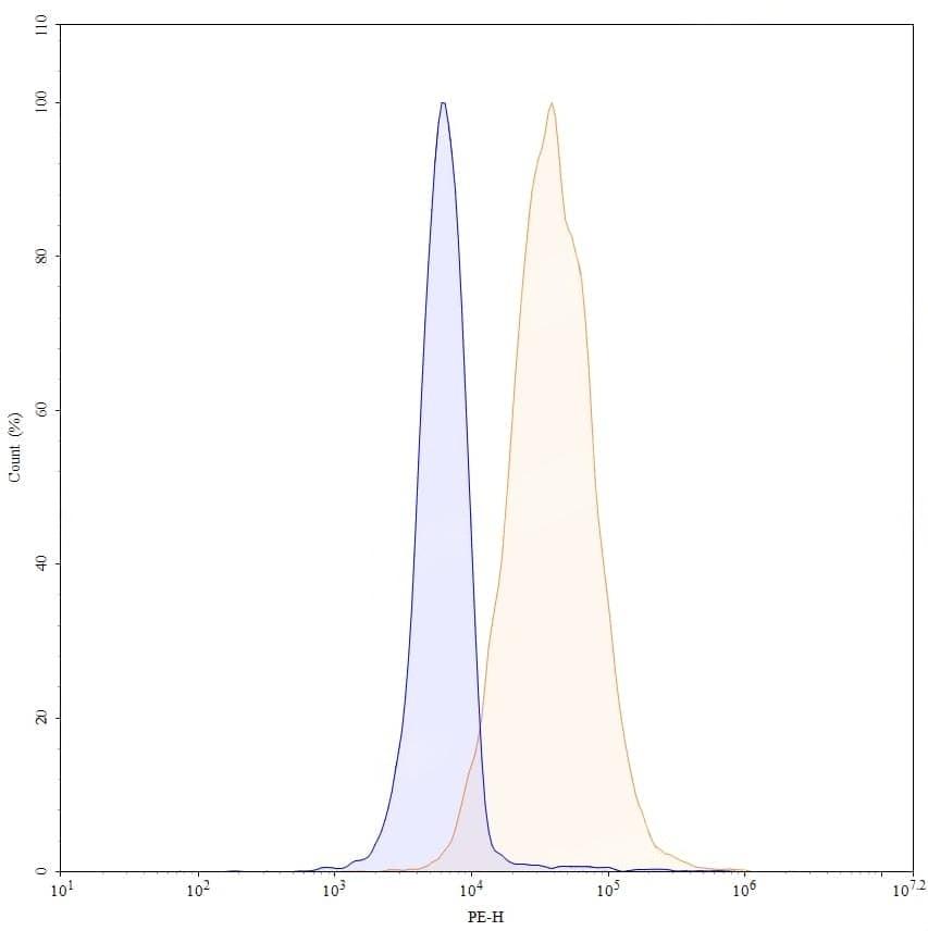 Flow-cytometry using PE anti-human CD73 antibody. U87 cells were stained with an irrelevant antibody (Blue Histogram) or an PE anti-human CD73 monoclonal antibody (Catalog No.:TD-HB209327, Yellow Histogram) at a concentration of 5 µg/ml for 30 mins at RT. After washing, and cells analysed on a NovoCyte Flow Cytometer.