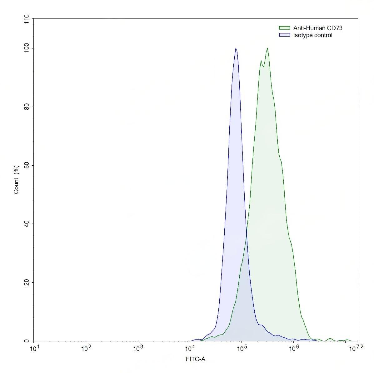 SEC-HPLC detection for Anti-Human CD73/NT5E Antibody (ABS1815). | Flow-cytometry using anti-human CD73 antibody.U87 cells were stained with an irrelevant antibody (Blue Histogram) or an anti-human CD73 antibody monoclonal antibody (Catalog No.:TD-HB209307 ,Green Histogram) at a concentration of 5 µg/ml for 30 mins at RT. After washing, bound antibody was detected using a FITC conjugated goat anti-mouse antibody (Catalog No.:TD-MF690414) and cells analysed on a NovoCyte Flow Cytometer.