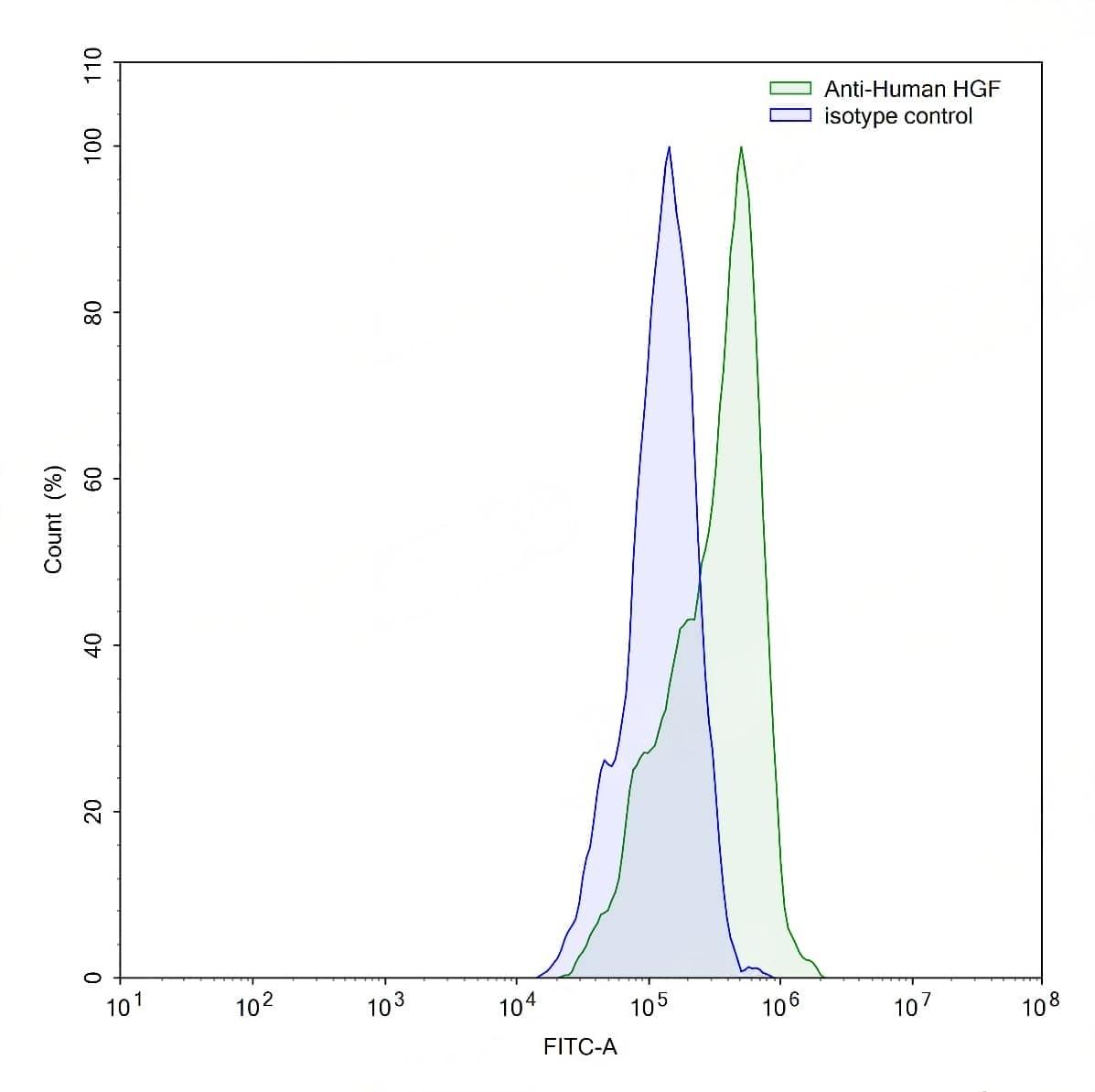 Flow-cytometry using anti-human HGF antibody.U87 cells were stained with an irrelevant antibody (Blue Histogram) or an anti-human HGF antibody monoclonal antibody (Catalog No.:TD-HB191107 ,Green Histogram) at a concentration of 5 µg/ml for 30 mins at RT. After washing, bound antibody was detected using a FITC conjugated goat anti-mouse antibody (Catalog No.:TD-MF690414) and cells analysed on a NovoCyte Flow Cytometer.