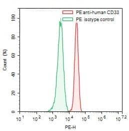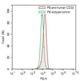 Flow-cytometry using PE anti-human CD33 antibody. RMPI-8226 cells were stained with an irrelevant antibody (Green Histogram) or a PE anti-human CD33 antibody monoclonal antibody (Catalog No.:TD-HB185127, Red Histogram) at a concentration of 5 µg/ml for 30 mins at RT. After washing, cells analysed on a NovoCyte Flow Cytometer. | Flow-cytometry using PE anti-human CD33 antibody. HL-60 cells were stained with an irrelevant antibody (Green Histogram) or a PE anti-human CD33 antibody monoclonal antibody (Catalog No.:TD-HB185127, Red Histogram) at a concentration of 5 µg/ml for 30 mins at RT. After washing, cells analysed on a NovoCyte Flow Cytometer.