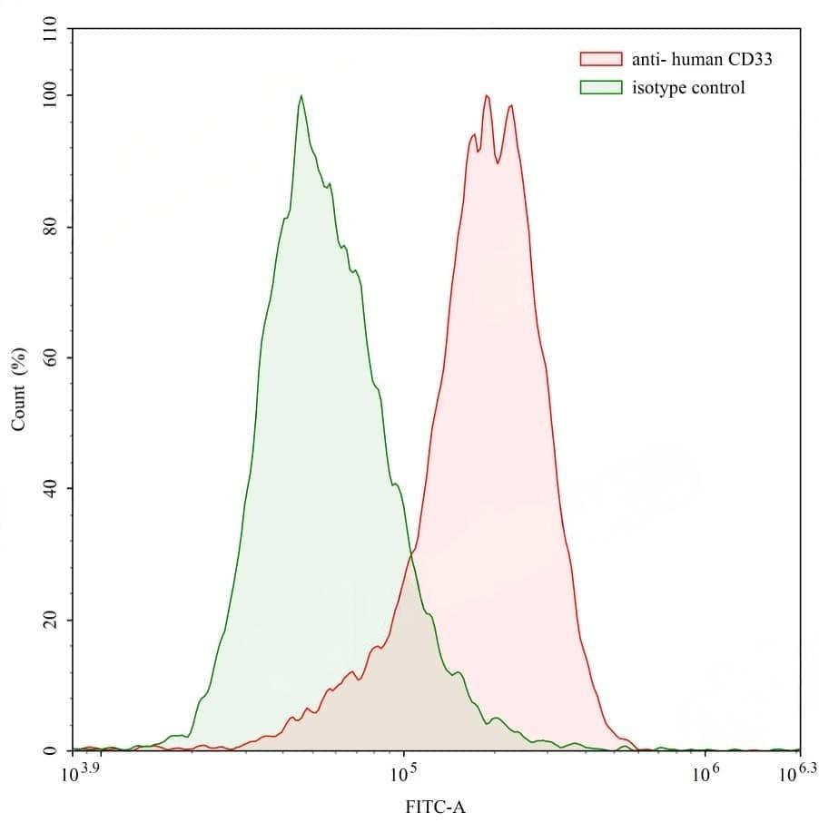 Flow-cytometry using anti-human CD33 antibody. Human U-937 cell line were stained with an irrelevant antibody (Green Histogram) or an anti-human CD33 antibody monoclonal antibody (Catalog No.:TD-HB185107 , Red Histogram) at a concentration of 20 µg/ml for 30 mins at RT. After washing, bound antibody was detected using a FITC conjugated goat anti-human antibody (Catalog No.:TD-HF690414) and cells analysed on a NovoCyte Flow Cytometer.