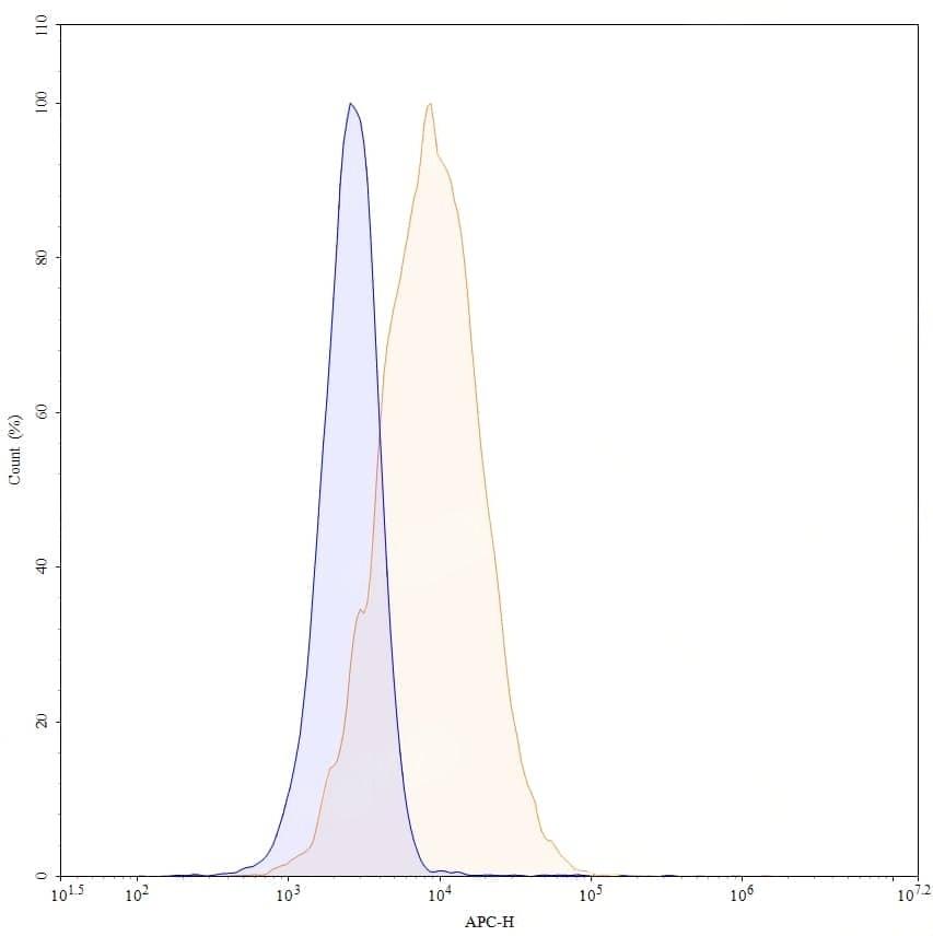 Flow-cytometry using APC anti-human CD185(CXCR5) antibody. Raji cells were stained with an irrelevant antibody (Green Histogram) or an APC anti-human CD185(CXCR5) antibody monoclonal antibody (Catalog No.:TD-HB160137, Red Histogram) at a concentration of 5 µg/ml for 30 mins at RT. After washing, cells analysed on a NovoCyte Flow Cytometer. | Flow-cytometry using APC anti-human CD185 antibody. Raji cells were stained with an irrelevant antibody (Blue Histogram) or an APC anti-human CD185 monoclonal antibody (Catalog No.:TD-HB160137, Yellow Histogram) at a concentration of 5 µg/ml for 30 mins at RT. After washing, cells analysed on a NovoCyte Flow Cytometer.