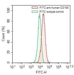 Flow-cytometry using FITC anti-human CD185(CXCR5) antibody. Raji cells were stained with an irrelevant antibody (Green Histogram) or a FITC anti-human CD185(CXCR5) antibody monoclonal antibody (Catalog No.:TD-HB160117, Red Histogram) at a concentration of 5 µg/ml for 30 mins at RT. After washing, cells analysed on a NovoCyte Flow Cytometer.