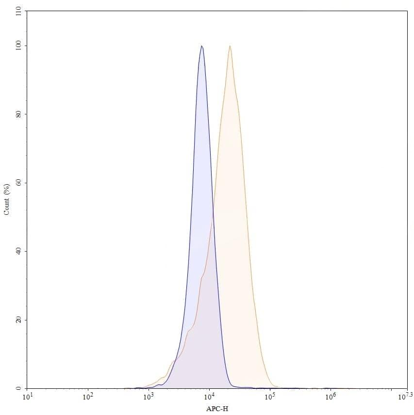 Flow-cytometry using APC anti-human CD171 antibody. Hela cells were stained with an irrelevant antibody (Blue Histogram) or an APC anti-human CD171 monoclonal antibody (Catalog No.:TD-HB159137, Yellow Histogram) at a concentration of 5 µg/ml for 30 mins at RT. After washing, and cells analysed on a NovoCyte Flow Cytometer.