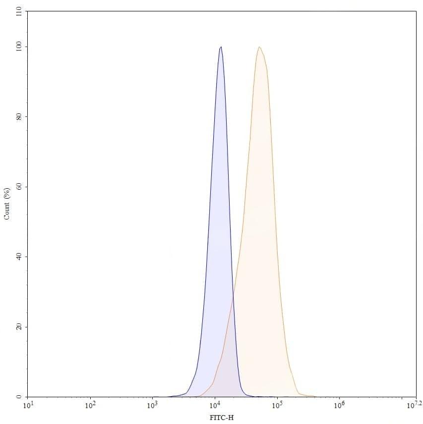 Flow-cytometry using FITC anti-human CD171 antibody. Hela cells were stained with an irrelevant antibody (Blue Histogram) or an FITC anti-human CD171 monoclonal antibody (Catalog No.:TD-HB159117, Yellow Histogram) at a concentration of 5 µg/ml for 30 mins at RT. After washing, and cells analysed on a NovoCyte Flow Cytometer.