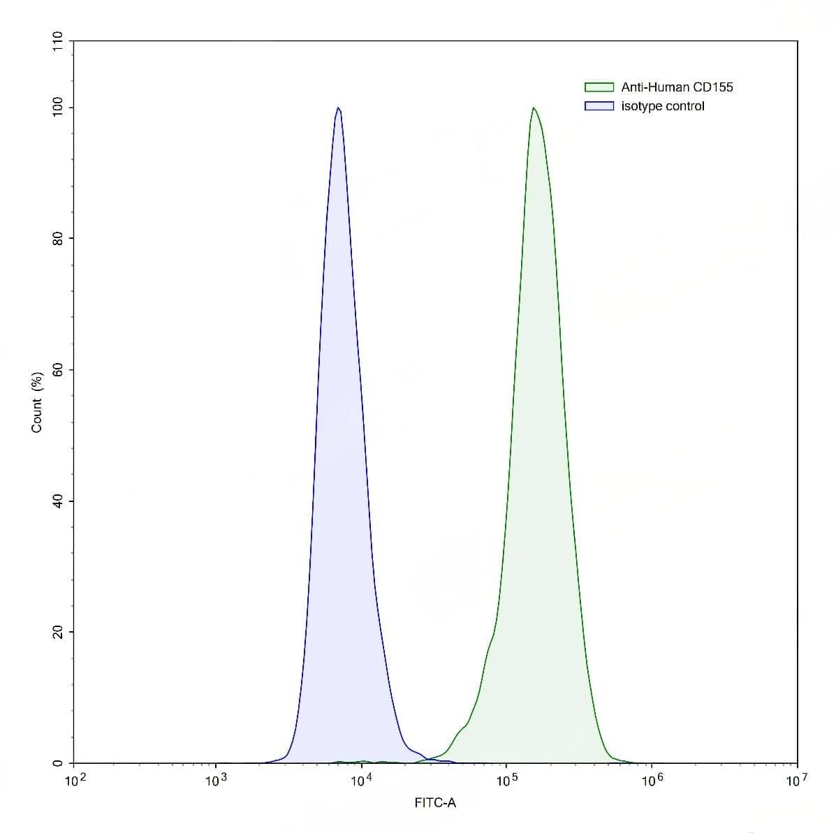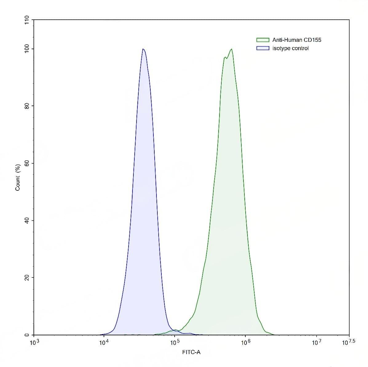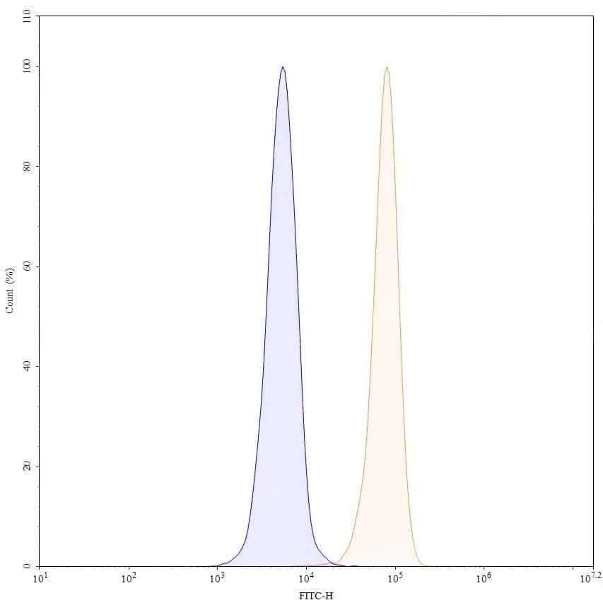 Flow-cytometry using anti-human CD155 antibody.HeLa cells were stained with an irrelevant antibody (Blue Histogram) or an anti-human CD155 antibody monoclonal antibody (Catalog No.:TD-HB135107 ,Green Histogram) at a concentration of 5 µg/ml for 30 mins at RT. After washing, bound antibody was detected using a FITC conjugated goat anti-mouse antibody (Catalog No.:TD-MF690414) and cells analysed on a NovoCyte Flow Cytometer. | Flow-cytometry using anti-human CD155 antibody.U937 cells were stained with an irrelevant antibody (Blue Histogram) or an anti-human CD155 antibody monoclonal antibody (Catalog No.:TD-HB135107 ,Green Histogram) at a concentration of 5 µg/ml for 30 mins at RT. After washing, bound antibody was detected using a FITC conjugated goat anti-mouse antibody (Catalog No.:TD-MF690414) and cells analysed on a NovoCyte Flow Cytometer. | Flow-cytometry using anti-human CD155 antibody. U937 cells were stained with an irrelevant antibody (Blue Histogram) or an anti-human CD155 monoclonal antibody (Catalog No.:TD-HB135107, Yellow Histogram) at a concentration of 5 µg/ml for 30 mins at RT. After washing, bound antibody was detected using a a Goat Anti-Mouse IgG H&L Polyclonal Antibody, FITC (Catalog No.:TD-MF690414) and cells analysed on a NovoCyte Flow Cytometer.