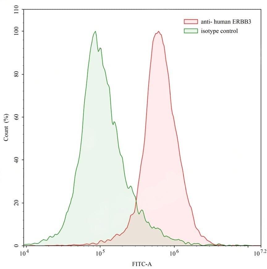 Flow-cytometry using anti-human ERBB3 antibody. Human SK-BR-3 cell line were stained with an irrelevant antibody (Green Histogram) or an anti-human ERBB3 antibody monoclonal antibody (Catalog No.:TD-HB116107 , Red Histogram) at a concentration of 20 µg/ml for 30 mins at RT. After washing, bound antibody was detected using a FITC conjugated goat anti-human antibody (Catalog No.:TD-HF690414) and cells analysed on a NovoCyte Flow Cytometer.