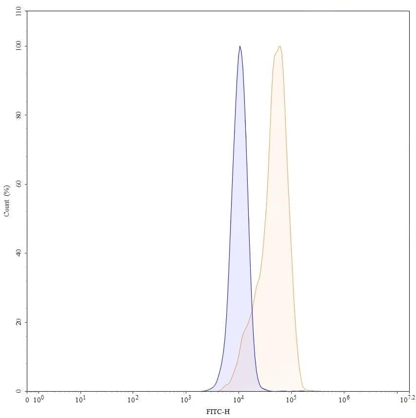 Flow-cytometry using FITC anti-human CD49c antibody. Hela cells were stained with an irrelevant antibody (Blue Histogram) or an FITC anti-human CD49c monoclonal antibody (Catalog No.:TD-HB114117, Yellow Histogram) at a concentration of 5 µg/ml for 30 mins at RT. After washing, and cells analysed on a NovoCyte Flow Cytometer.