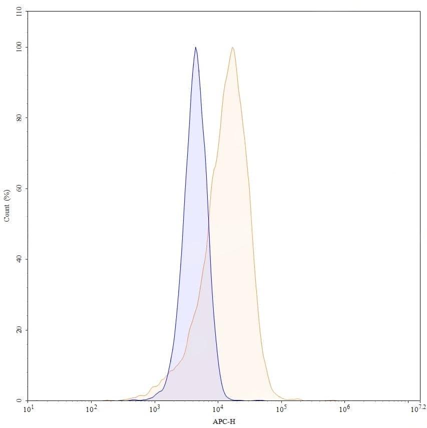 Flow-cytometry using APC anti-human CD30 antibody. Jurkat cells were stained with an irrelevant antibody (Blue Histogram) or an APC anti-human CD30 monoclonal antibody (Catalog No.:TD-HB038437, Yellow Histogram) at a concentration of 5 µg/ml for 30 mins at RT. After washing, and cells analysed on a NovoCyte Flow Cytometer.