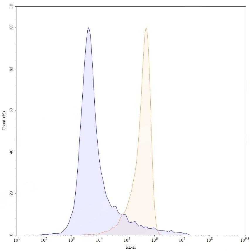 Flow-cytometry using PE anti-human CD22 antibody. Daudi cells were stained with an irrelevant antibody (Blue Histogram) or an PE anti-human CD22 monoclonal antibody (Catalog No.:TD-HB011327, Yellow Histogram) at a concentration of 5 µg/ml for 30 mins at RT. After washing, and cells analysed on a NovoCyte Flow Cytometer.
