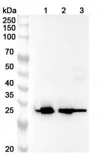 SEC-HPLC detection for Anti-Mouse APOE Antibody (HJ6.3). | SDS-PAGE for Anti-Mouse APOE Antibody (HJ6.3). | Western blot analysis was performed using anti-APOE monoclonal antibody at 1ug/mL on various samples.Lane 1:Mouse liver lysateLane 2:Mouse brain lysateLane 3:Mouse heart lysate