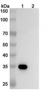 SDS-PAGE for Anti-Staphylococcus aureus Alpha-toxin/hly/AT Antibody (2A3.1) | Western blot analysis was performed using anti-a1AT/Serpin A1/SERPINA1 monoclonal antibody at 1ug/mL on various samples.Lane 1:recombinant human a1AT/Serpin A1/SERPINA1 (Catalog No.:TD-HF638012)Lane 2:negative control