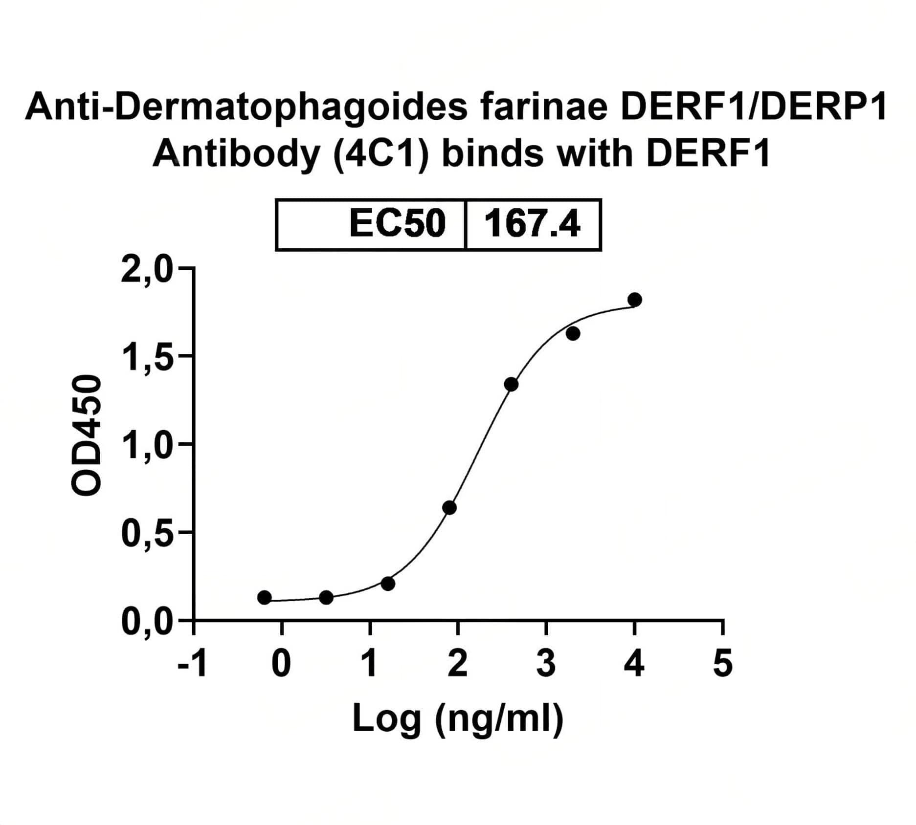 Detects Dermatophagoides farinae (American house dust mite), Dermatophagoides pteronyssinus (European house dust mite) DERF1/DERP1 in indirect ELISAs. | SDS-PAGE for Anti-Dermatophagoides farinae DERF1/DERP1 Antibody (4C1). | Western blot analysis was performed using anti-American house dust mite DERF1 monoclonal antibody at 1ug/mL on various samples.Lane 1:recombinant American house dust mite Der f 1/DERF1 (Catalog No.:TD-JN021011)Lane 2:negative control