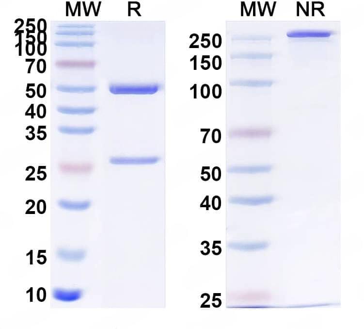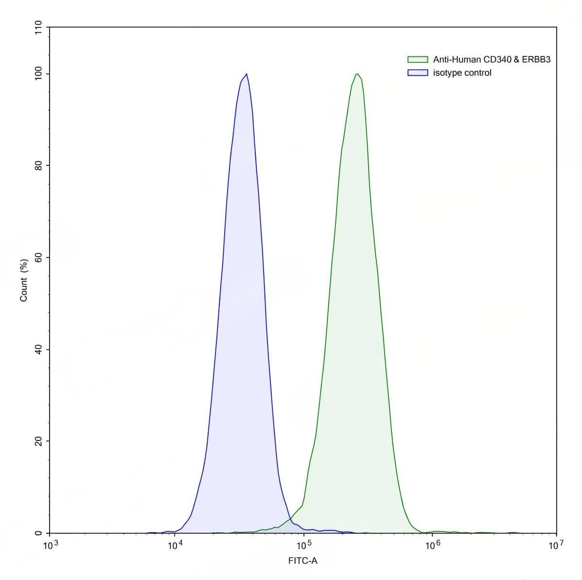 Flow-cytometry using anti-human CD340 & ERBB3 antibody.HeLa cells were stained with an irrelevant antibody (Blue Histogram) or an anti-human CD340 & ERBB3 antibody monoclonal antibody (Catalog No.:TD-HY286043 ,Green Histogram) at a concentration of 5 µg/ml for 30 mins at RT. After washing, bound antibody was detected using a FITC conjugated goat anti-human antibody (Catalog No.:TD-HF690414) and cells analysed on a NovoCyte Flow Cytometer. | SDS-PAGE for Anti-Human CD340/ERBB2/HER2 Antibody (SAA2012).
