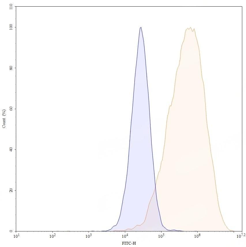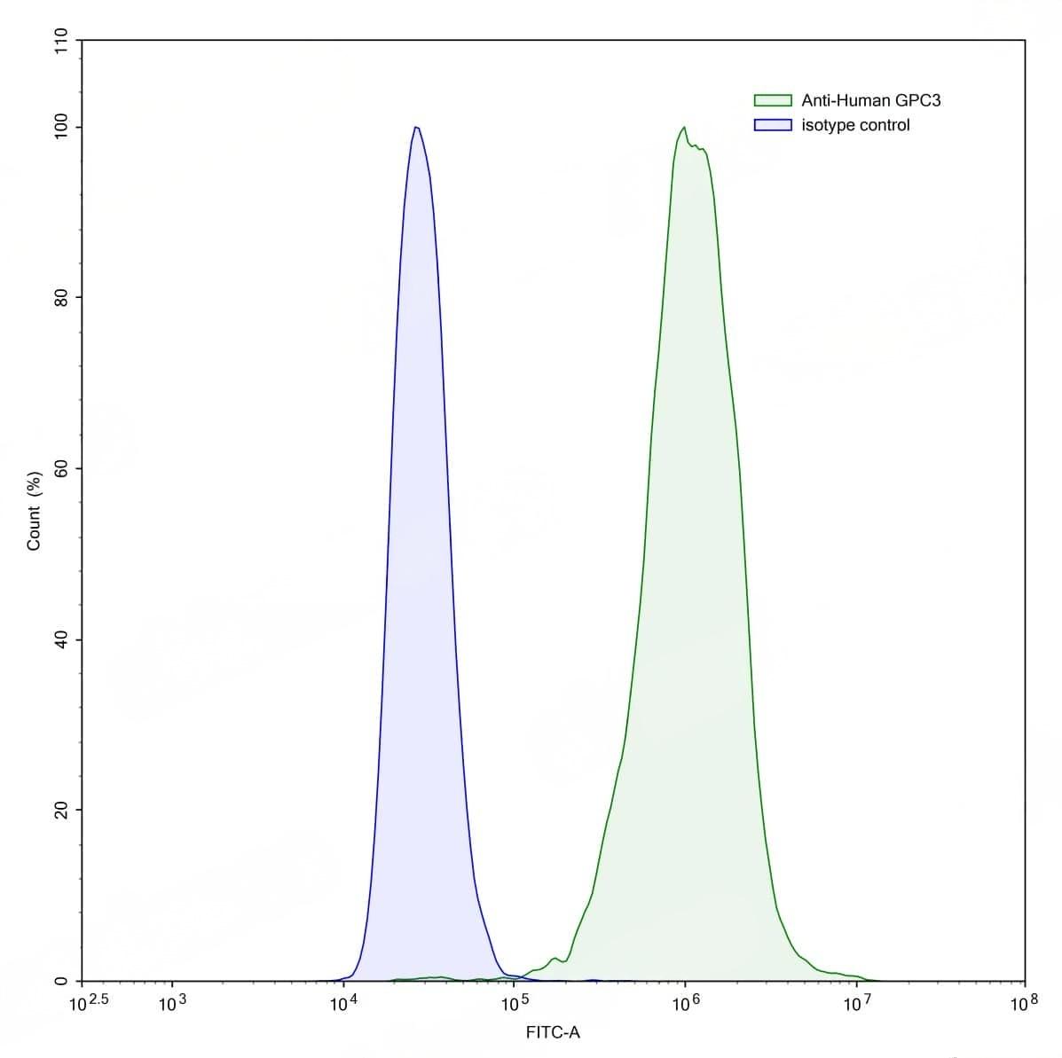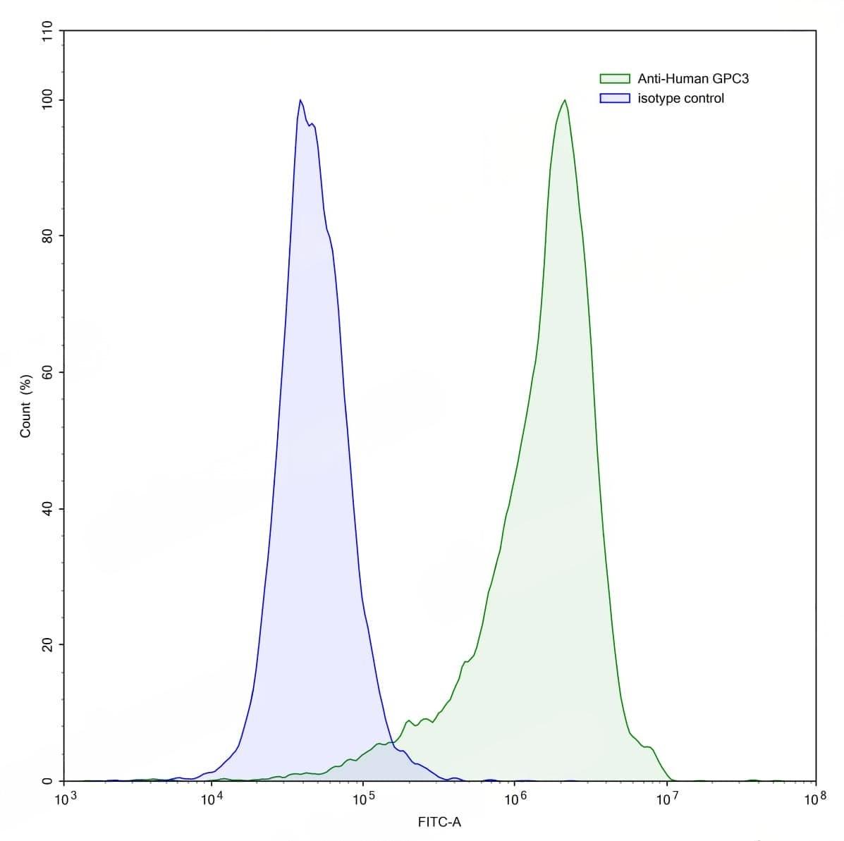 Detects Human GPC3 in indirect ELISAs. | Flow-cytometry using anti-human GPC3 antibody.GPC3 Transfected CHO cells were stained with an irrelevant antibody (Blue Histogram) or an anti-human GPC3 antibody monoclonal antibody (Catalog No.:TD-HW310023 ,Green Histogram) at a concentration of 5 µg/ml for 30 mins at RT. After washing, bound antibody was detected using a FITC conjugated goat anti-human antibody (Catalog No.:TD-HF690414) and cells analysed on a NovoCyte Flow Cytometer.,Flow-cytometry using anti-human GPC3 antibody.HepG2 cells were stained with an irrelevant antibody (Blue Histogram) or an anti-human GPC3 antibody monoclonal antibody (Catalog No.:TD-HW310023 ,Green Histogram) at a concentration of 5 µg/ml for 30 mins at RT. After washing, bound antibody was detected using a FITC conjugated goat anti-human antibody (Catalog No.:TD-HF690414) and cells analysed on a NovoCyte Flow Cytometer.,Flow-cytometry using anti-human GPC3 antibody.Human Jurkat cell line were stained with an irrelevant antibody (Blue Histogram) or an anti-human GPC3 antibody monoclonal antibody (Catalog No.:TD-HW310023 ,Green Histogram) at a concentration of 5 µg/ml for 30 mins at RT. After washing, bound antibody was detected using a FITC conjugated goat anti-human antibody (Catalog No.:TD-HF690414) and cells analysed on a NovoCyte Flow Cytometer. | SDS-PAGE for Anti-Human GPC3 Antibody (YP7). | Flow-cytometry using anti-human GPC3 antibody. Untransfected cells (blue Histogram) and Transfected cells (Yellow Histogram) were stained with an anti-human GPC3 monoclonal antibody (Catalog No.:TD-HW310023) at a concentration of 5 µg/ml for 30 mins at RT. After washing, bound antibody was detected using a Goat Anti-Human IgG H&L Polyclonal Antibody, FITC (Catalog No.:TD-HF690414) and cells analysed on a NovoCyte Flow Cytometer. | Western blot analysis was performed using anti-GPC3/Glypican 3 monoclonal antibody at 1µg/ml on various samples.Lane 1:recombinant mouse GPC3/Glypican 3 (Catalog No.:TD-MW310011)Lane 2:negative control,Western blot analysis was performed using anti-GPC3 monoclonal antibody at 1ug/mL on various samples.Lane 1:HepG2 cell lysate