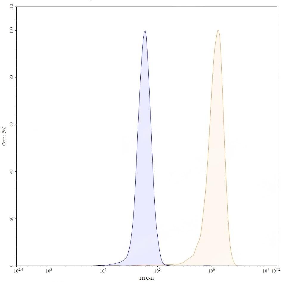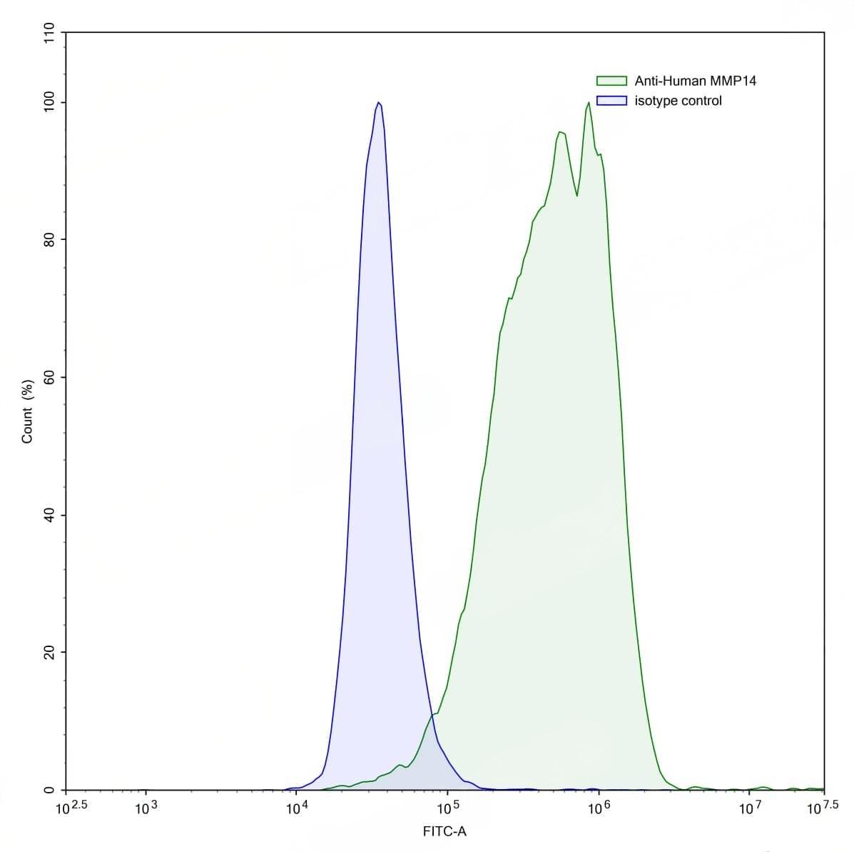 Detects MMP14 in indirect ELISAs. | SDS-PAGE for Anti-Human MMP14 Antibody (LEM-2/15). | Flow-cytometry using anti-human MMP14 antibody.MDA-MB-231 cells were stained with an irrelevant antibody (Blue Histogram) or an anti-human MMP14 antibody monoclonal antibody (Catalog No.:TD-HW299013 ,Green Histogram) at a concentration of 5 µg/ml for 30 mins at RT. After washing, bound antibody was detected using a FITC conjugated goat anti-mouse antibody (Catalog No.:TD-MF690414) and cells analysed on a NovoCyte Flow Cytometer. | Western blot analysis was performed using anti-MMP14 monoclonal antibody at 1ug/mL on various samples.Lane 1:recombinant human MMP14 (Catalog No.:TD-HW299022)Lane 2:negative control | Flow-cytometry using anti-human MMP14 antibody. BXPC3 cells were fixed and permeabilized, then stained with an irrelevant antibody (Blue Histogram) or an anti-human MMP14 monoclonal antibody (Catalog No.:TD-HW299013, Yellow Histogram) at a concentration of 5 µg/ml for 30 mins at RT. After washing, bound antibody was detected using Goat Anti-Mouse IgG H&L Polyclonal Antibody, FITC (Catalog No.:TD-MF690414) and cells analysed on a NovoCyte Flow Cytometer.