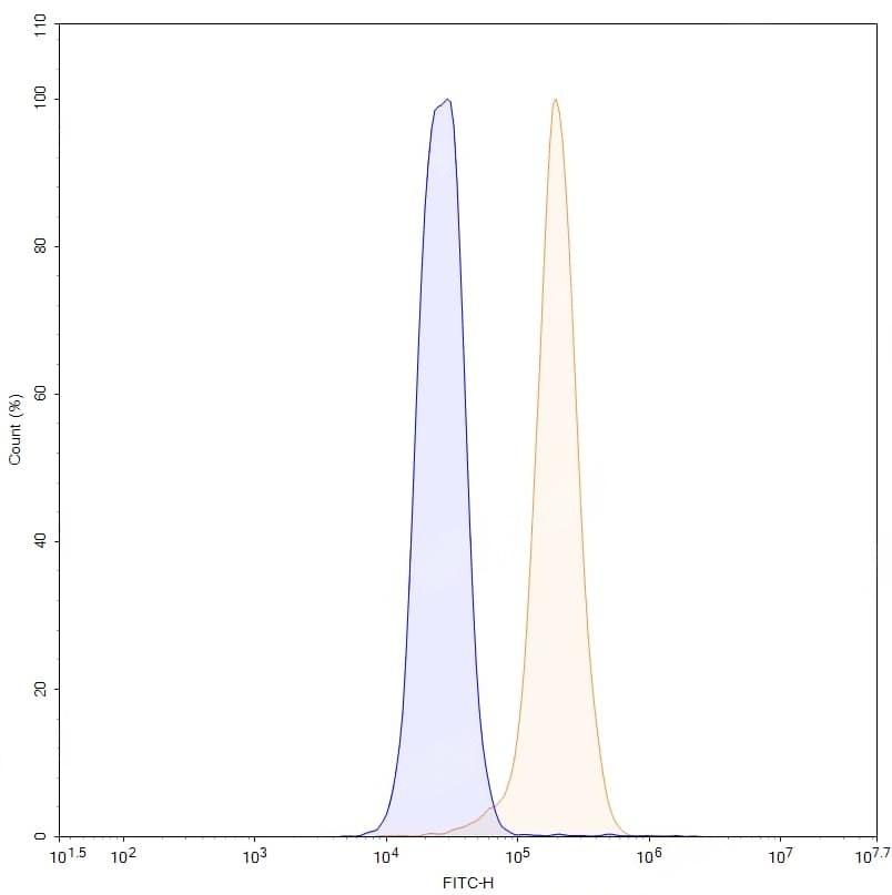 SDS-PAGE for Anti-Human LEAP2 Antibody (SAA2082). | Flow-cytometry using anti-human leap2 antibody. HepG2 cells were stained with an irrelevant antibody (Blue Histogram) or an anti-human leap2 monoclonal antibody (Catalog No.:TD-HV998023, Yellow Histogram) at a concentration of 5 µg/ml for 30 mins at RT. After washing, bound antibody was detected using a Goat Anti-Mouse IgG H&L Polyclonal Antibody, FITC (Catalog No.:TD-MF690414) and cells analysed on a NovoCyte Flow Cytometer.