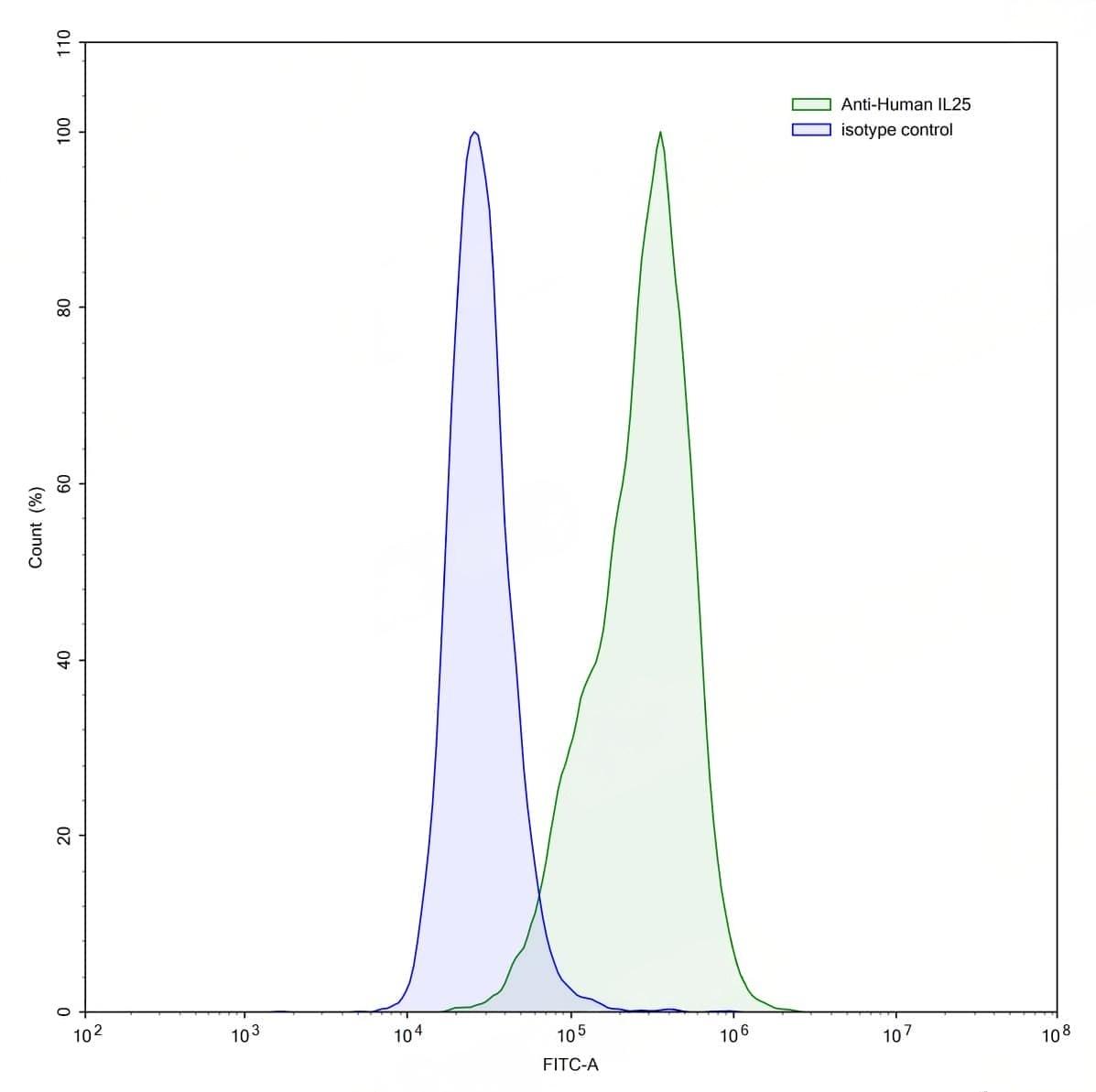 Detects Human IL25/IL17E in indirect ELISAs. | Flow-cytometry using anti-human IL25 antibody.PC-3 cells were stained with an irrelevant antibody (Blue Histogram) or an anti-human IL25 antibody monoclonal antibody (Catalog No.:TD-HV984013 ,Green Histogram) at a concentration of 5 µg/ml for 30 mins at RT. After washing, bound antibody was detected using a FITC conjugated goat anti-mouse antibody (Catalog No.:TD-MF690414) and cells analysed on a NovoCyte Flow Cytometer. | SDS-PAGE for Anti-Human IL25/IL17E Antibody (2c3).
