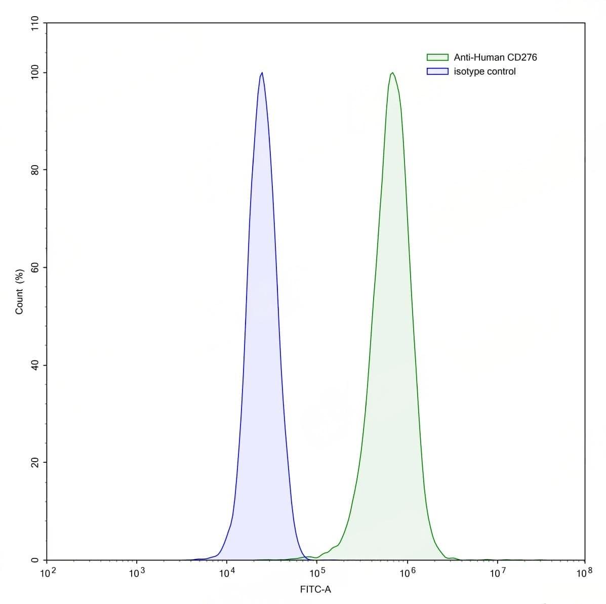 Flow-cytometry using anti-human CD276 antibody.PC-3 cells were stained with an irrelevant antibody (Blue Histogram) or an anti-human CD276 antibody monoclonal antibody (Catalog No.:TD-HV612013 ,Green Histogram) at a concentration of 5 µg/ml for 30 mins at RT. After washing, bound antibody was detected using a FITC conjugated goat anti-human antibody (Catalog No.:TD-HF690414) and cells analysed on a NovoCyte Flow Cytometer. | SDS-PAGE for Anti-Human CD276/B7-H3 Antibody (SAA2010).