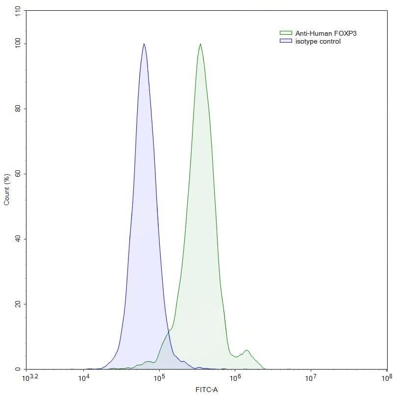 Flow-cytometry using anti-human FOXP3 antibody. Jurkat cells were stained with an irrelevant antibody (Blue Histogram) or an anti-human FOXP3 antibody monoclonal antibody (Catalog No.:TD-HV388045, Green Histogram) at a concentration of 5 µg/ml for 30 mins at RT. After washing, bound antibody was detected using a FITC conjugated goat anti-mouse antibody (TD-MF690414) and cells analysed on a NovoCyte Flow Cytometer.,Flow-cytometry using anti-human FOXP3 antibody. Hela cells were stained with an irrelevant antibody (Blue Histogram) or an anti-human FOXP3 antibody monoclonal antibody (Catalog No.:TD-HV388045, Green Histogram) at a concentration of 5 µg/ml for 30 mins at RT. After washing, bound antibody was detected using a FITC conjugated goat anti-mouse antibody (TD-MF690414) and cells analysed on a NovoCyte Flow Cytometer.