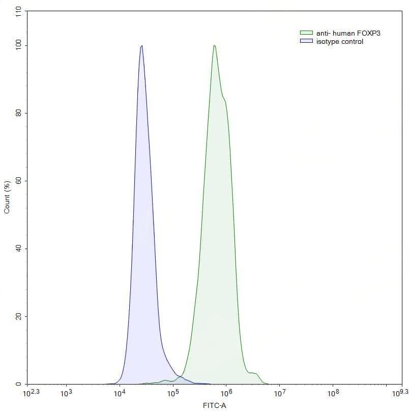 Flow-cytometry using anti-human FOXP3 antibody. Jurkat cells were stained with an irrelevant antibody (Blue Histogram) or an anti-human FOXP3 antibody monoclonal antibody (Catalog No.:TD-HV388035, Green Histogram) at a concentration of 5 µg/ml for 30 mins at RT. After washing, bound antibody was detected using a FITC conjugated goat anti-mouse antibody (TD-MF690414) and cells analysed on a NovoCyte Flow Cytometer.,Flow-cytometry using anti-human FOXP3 antibody. Hela cells were stained with an irrelevant antibody (Blue Histogram) or an anti-human FOXP3 antibody monoclonal antibody (Catalog No.:TD-HV388035, Green Histogram) at a concentration of 5 µg/ml for 30 mins at RT. After washing, bound antibody was detected using a FITC conjugated goat anti-mouse antibody (TD-MF690414) and cells analysed on a NovoCyte Flow Cytometer.