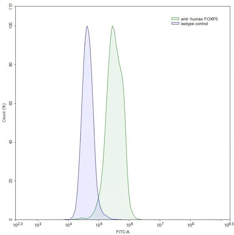 Flow-cytometry using anti-human FOXP3 antibody. Jurkat cells were stained with an irrelevant antibody (Blue Histogram) or an anti-human FOXP3 antibody monoclonal antibody (Catalog No.:TD-HV388015, Green Histogram) at a concentration of 5 µg/ml for 30 mins at RT. After washing, bound antibody was detected using a FITC conjugated goat anti-mouse antibody (TD-MF690414) and cells analysed on a NovoCyte Flow Cytometer.,Flow-cytometry using anti-human FOXP3 antibody. Hela cells were stained with an irrelevant antibody (Blue Histogram) or an anti-human FOXP3 antibody monoclonal antibody (Catalog No.:TD-HV388015, Green Histogram) at a concentration of 5 µg/ml for 30 mins at RT. After washing, bound antibody was detected using a FITC conjugated goat anti-mouse antibody (TD-MF690414) and cells analysed on a NovoCyte Flow Cytometer