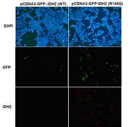 HEK293T cells were transfected with pCDNA3-GFP-IDH2 (WT) plasmid (left column) or pCDNA3-GFP-IDH2(R140Q) plasmid (right column), then fixed and stained with anti-IDH2(R140Q) monoclonal antibody (Cat. #TD-26165).