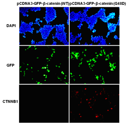 Immunofluorescence of cells expressing β-catenin proteins with anti- β-catenin (G48D) antibody. HEK293T cells were transfected with pCDNA3-GFP-β-catenin (WT) plasmid (left column) or pCDNA3-GFP-β-catenin (G48D) plasmid (right column), then fixed and stained with anti- β-catenin (G48D) monoclonal antibody (Cat. #TD-26166).