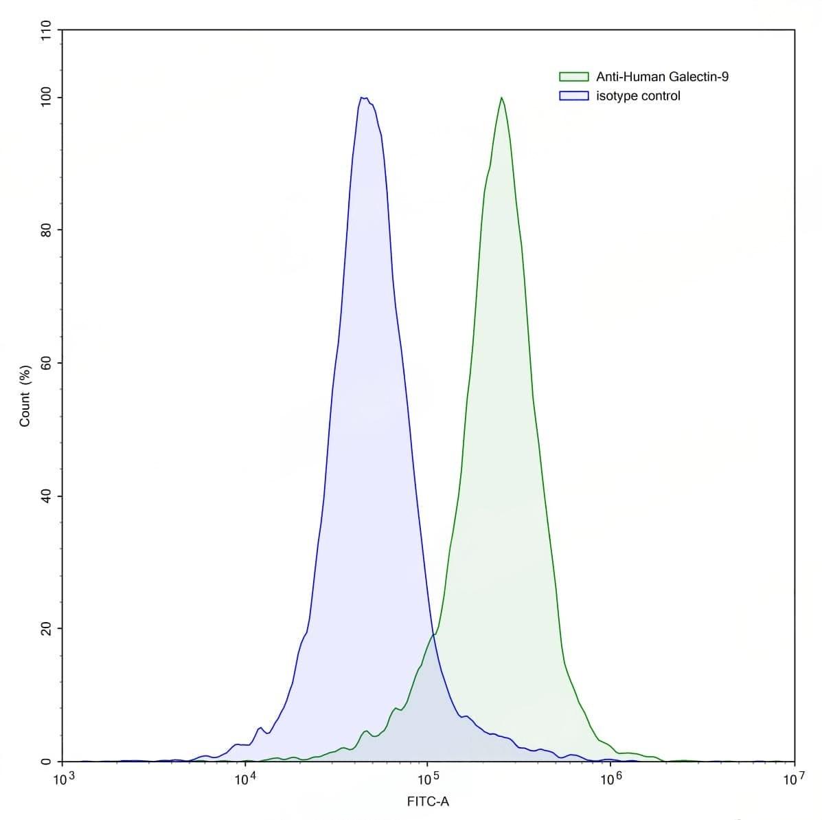 Flow-cytometry using anti-human Galectin-9 antibody.Human Jurkat cell line were stained with an irrelevant antibody (Blue Histogram) or an anti-human Galectin-9 antibody monoclonal antibody (Catalog No.:TD-HT173013 ,Green Histogram) at a concentration of 5 µg/ml for 30 mins at RT. After washing, bound antibody was detected using a FITC conjugated goat anti-mouse antibody (Catalog No.:TD-MF690414) and cells analysed on a NovoCyte Flow Cytometer.,Flow-cytometry using anti-human Galectin-9 antibody.MOLT-4 cells were stained with an irrelevant antibody (Blue Histogram) or an anti-human Galectin-9 antibody monoclonal antibody (Catalog No.:TD-HT173013 ,Green Histogram) at a concentration of 5 µg/ml for 30 mins at RT. After washing, bound antibody was detected using a FITC conjugated goat anti-mouse antibody (Catalog No.:TD-MF690414) and cells analysed on a NovoCyte Flow Cytometer.,Flow-cytometry using anti-human Galectin-9 antibody.Human peripheral blood lymphocytes were stained with an irrelevant antibody (Blue Histogram) or an anti-human Galectin-9 antibody monoclonal antibody (Catalog No.:TD-HT173013 ,Green Histogram) at a concentration of 5 µg/ml for 30 mins at RT. After washing, bound antibody was detected using a FITC conjugated goat anti-mouse antibody (Catalog No.:TD-MF690414) and cells analysed on a NovoCyte Flow Cytometer. | SDS-PAGE for Anti-Human Gal-9/LGALS9 Antibody (G9.2-17). | Flow-cytometry using anti-human Galectin-9 antibody. THP-1 cells were fixed and permeabilized, then stained with an irrelevant antibody (Blue Histogram) or an anti-human Galectin-9 monoclonal antibody (Catalog No.:TD-HT173013, Yellow Histogram) at a concentration of 5 µg/ml for 30 mins at RT. After washing, bound antibody was detected using Goat Anti-Mouse IgG H&L Polyclonal Antibody, FITC (Catalog No.:TD-MF690414) and cells analysed on a NovoCyte Flow Cytometer.