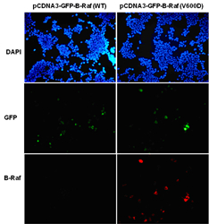 Immunofluorescence of cells expressing B-Raf proteins with Anti-BRaf(V600D) antibody. HEK293T cells were transfected with pCDNA3-GFP-B-Raf (WT) plasmid (left column) or pCDNA3-GFP-BRaf(V600D) plasmid (right column), then fixed and stained with Anti-BRaf(V600D) monoclonal antibody (Cat. #TD-26184). |